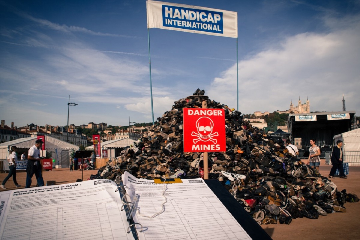 Handicap internationale appel les français à la mobilsation lors de la 22e pyramides des chaussures
